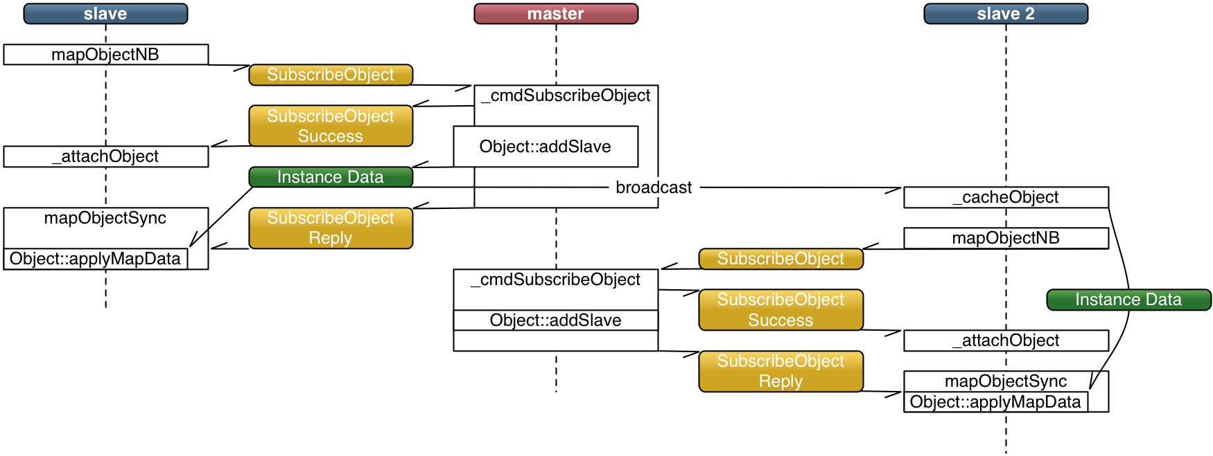 When using an object instance data cache, the master instance broadcasts the object instance data to the first slave node mapping the object. Each node receiving the data will enter it into its own cache. Subsequent slave nodes use the instance data from the cache and only need a registration handshake with the master instance.