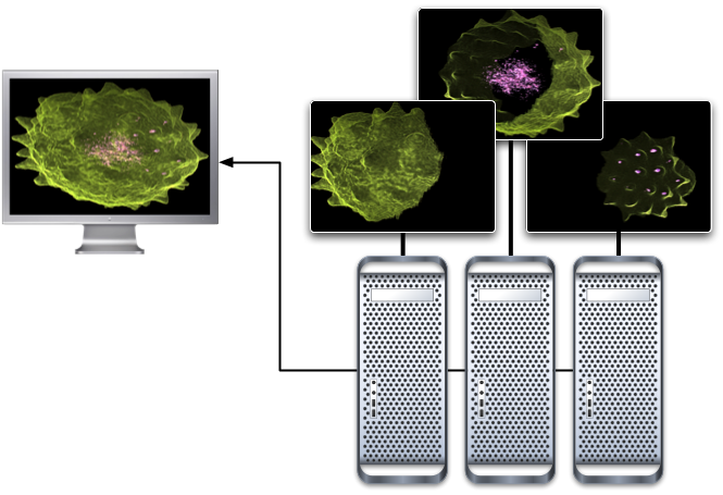 Scalable rendering combines multiple graphic cards, processors and systems to render a single (or multiple) views. Various algorithms are implemented by Equalizer, as described on the scalability page, and can be combined in any way for rendering. Examples of this use case are using two graphic cards in one system to render each one eye view in stereo rendering, or using a cluster of machines to divide the database for rendering, as shown on the left.