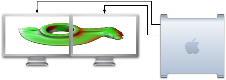 Display walls are one of the most common use case for visualization clusters today. Equalizer can drive such large scale displays. The typical configuration, as shown on the right, executes one instance of the application's rendering code for each display. The applications will therefore get optimal performance due to the local, parallel OpenGL execution for each display device.
